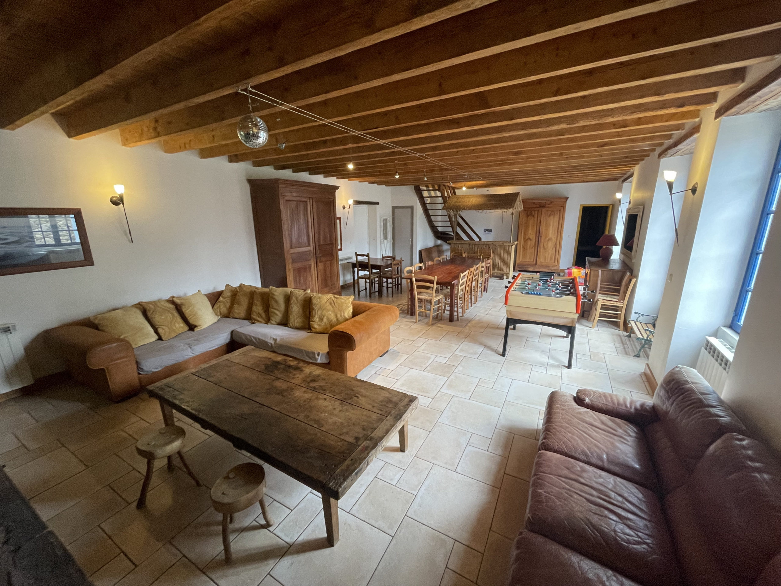 Le salon du gîte mitoyen à la salle peut accueillir vos enfants et leur offrir tout le confort dont ils ont besoin pour une soirée paisible tout en étant à vos côtés. Ils pourront faire leur soirée à leur rythme, avec une grande tablée pour manger , WC, Jouets, baby-foot, lieu idéal pour le baby-sitting.