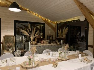 La guirlande lumineuse est installée le long des poutres pour créer une ambiance douce lors de votre mariage.